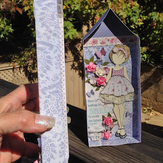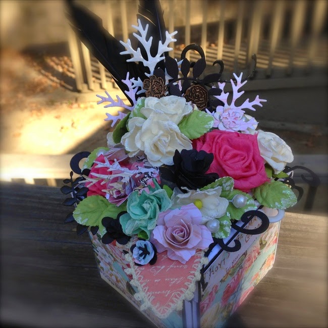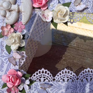 The white, snowy card has just a few patterned paper layers, a die cut doily shape and then the beautiful sparkling branch as the center of attention. The chipboard word also from the kit got a coat of white gesso on top and then the glitter on top of the wet paint.