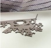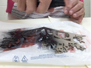 I cut out a tag and positioned the rectangle so there was a hole near the top.  I applied mod podge to the tag and placed the small pieces in a grouping I liked.  I then placed the larger rectangle around the pieces.