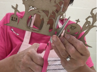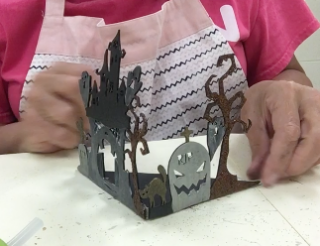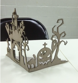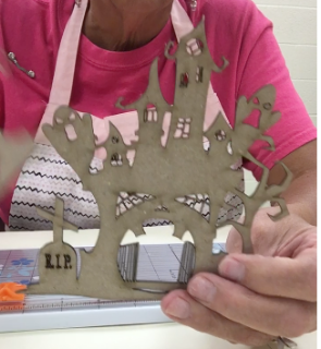 I cut a triangle piece of chipboard to make the piece stand to make a spooky tea light holder.