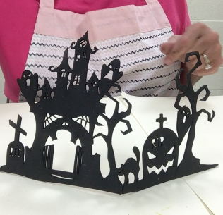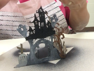 This project is for Spooky Halloween.  I used the Halloween border and cut in half at the cat.  I then hinged them together with a piece of card stock.  I used black mist to cover the entire piece and dried with a heat gun.  I the applied several layer of colors and glitter to highlight the cutouts.